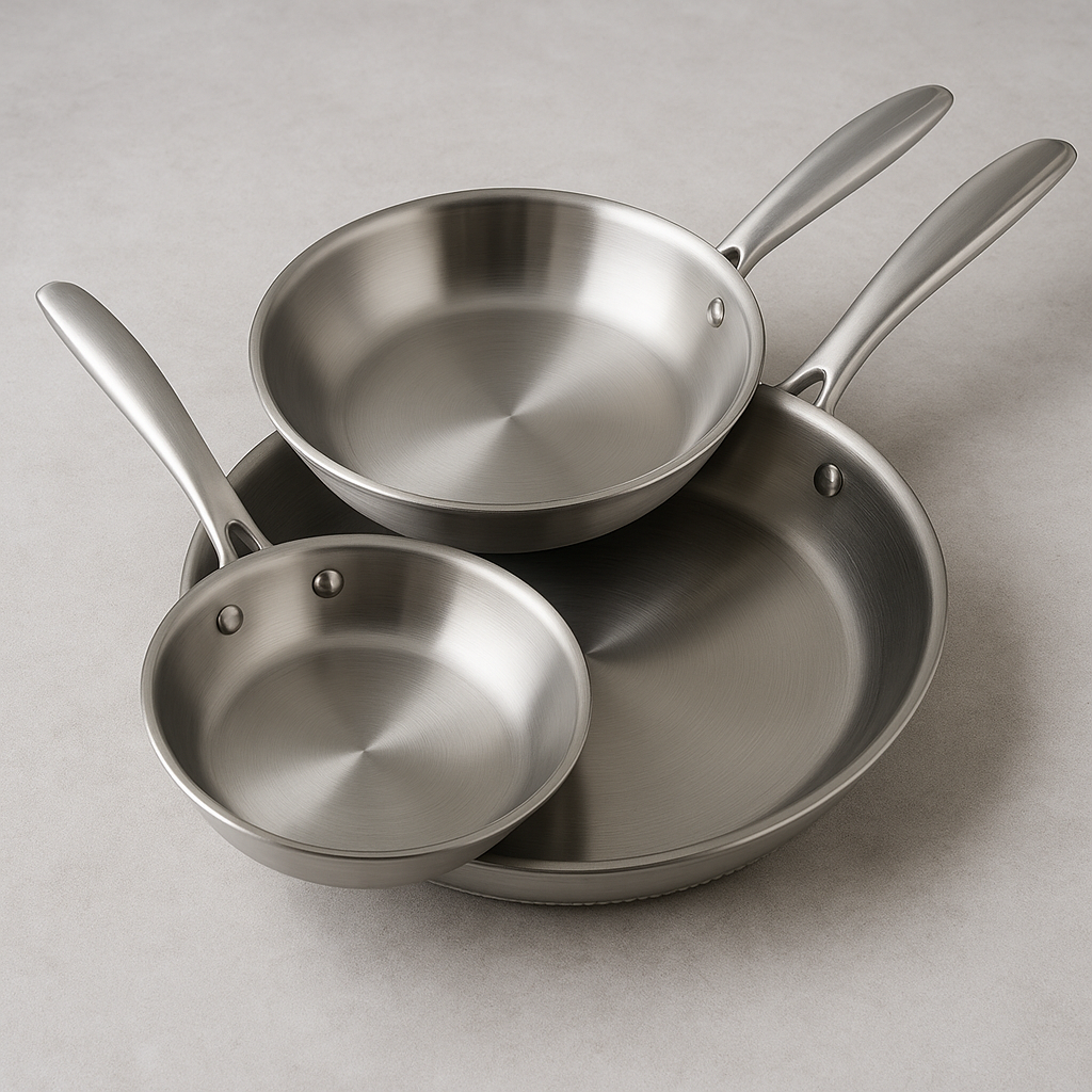 1️⃣ Lot 3 poêles inox essentielles (Ø20, Ø24, Ø28 cm) : Trois diamètres indispensables pour couvrir tous les usages : portions individuelles, cuisson familiale, grandes préparations. Un set polyvalent pour le quotidien comme pour les repas d’exception.
